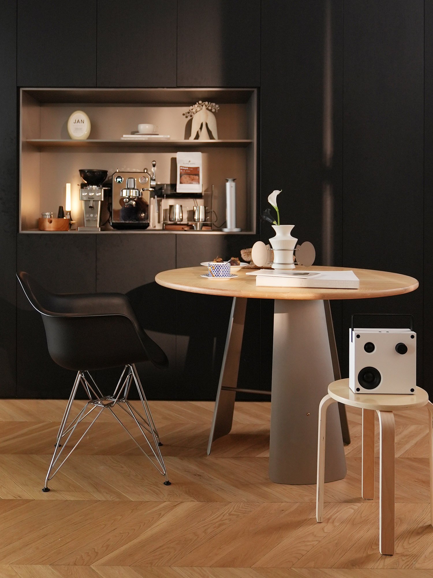 In the new version, the tabletop is made of rubberwood finger-jointed panels with a white oak veneer inlay, creating beautiful patterns while preventing cracking and deformation.